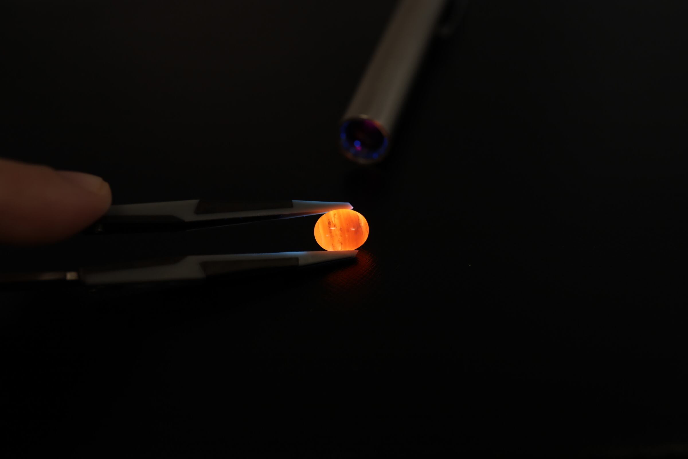 そのままでも十分に魅力的ですが、光にかざすと模様が鮮明になり、UVライトをあてれば溶けた鉄のような鮮やかな橙色に蛍光します。
